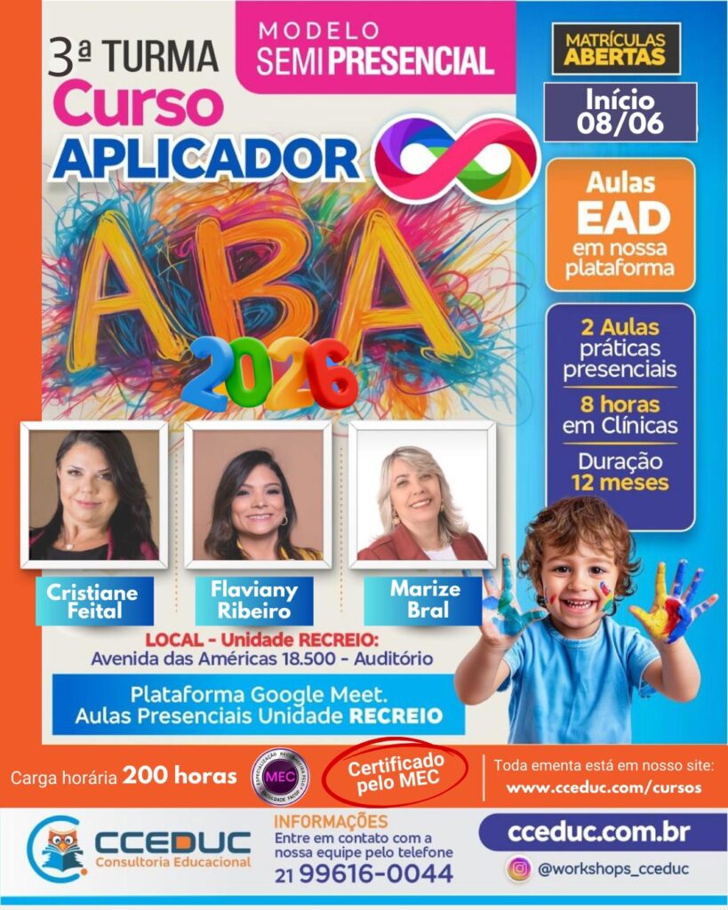 O curso de Aplicador ABA, será ministrado pelas: Doutora Carla Cristina de Souza, Mestra Cristiane Feital, e Mestra Debora Gomes, ambas especialistas no assunto.